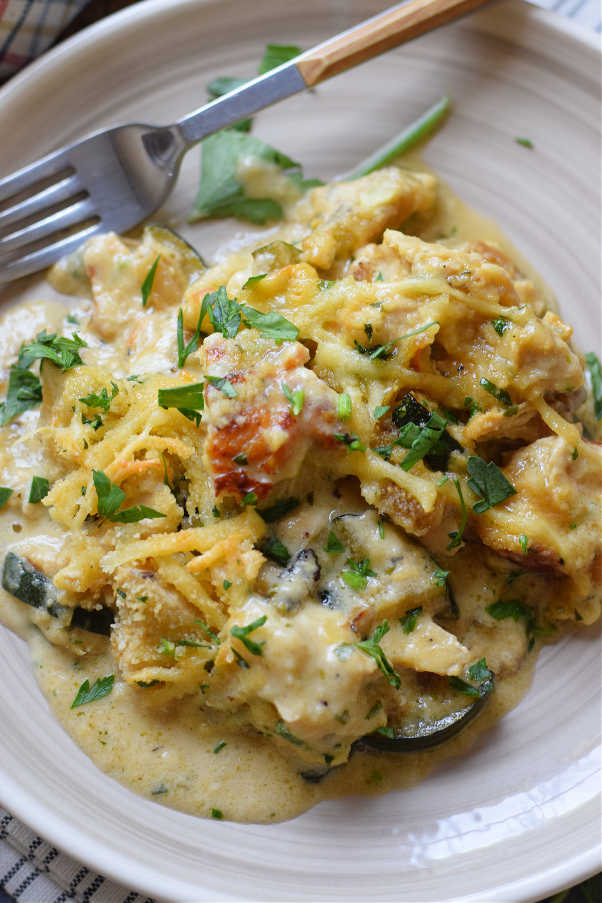 What could be a better comforting dish than this Creamy Chicken and Zucchini Casserole. Tender pieces of chicken, sauteed zucchini and a creamy cheese sauce topped with a herb bread crumb mixture and extra cheese. A great make ahead meal for busy weeknights!