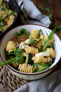 A fresh and light addition to your spring pasta dishes. Thisย Zucchini Pasta Salad in a Lemon Vinaigretteย is filled with seasonal zucchini, sun dried tomatoes and fresh mozzarella. Then topped off with a tangy vinaigrette. Make it for your next lunch or side dish to a weekend barbecue.