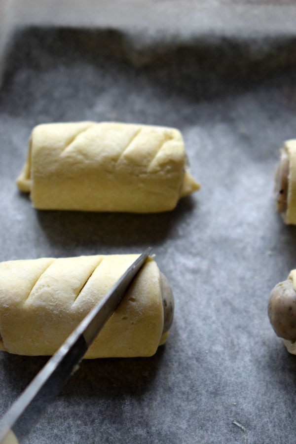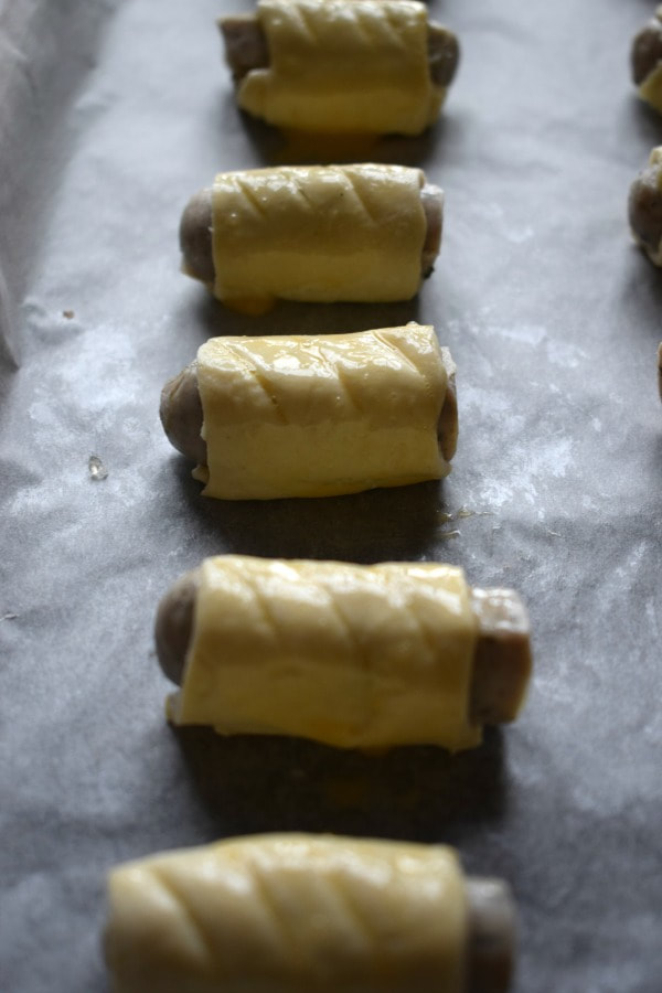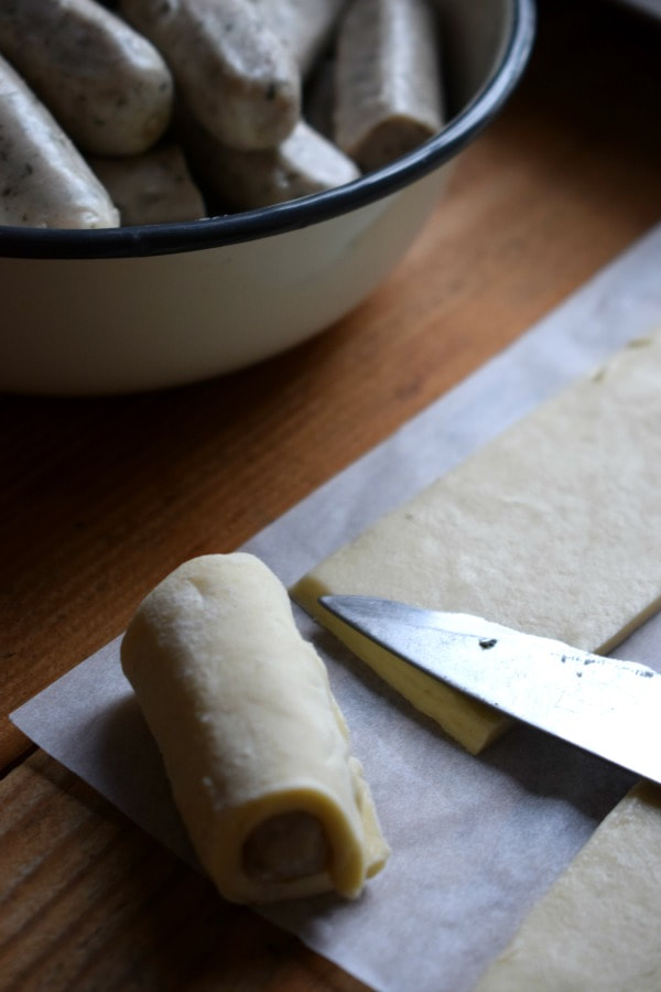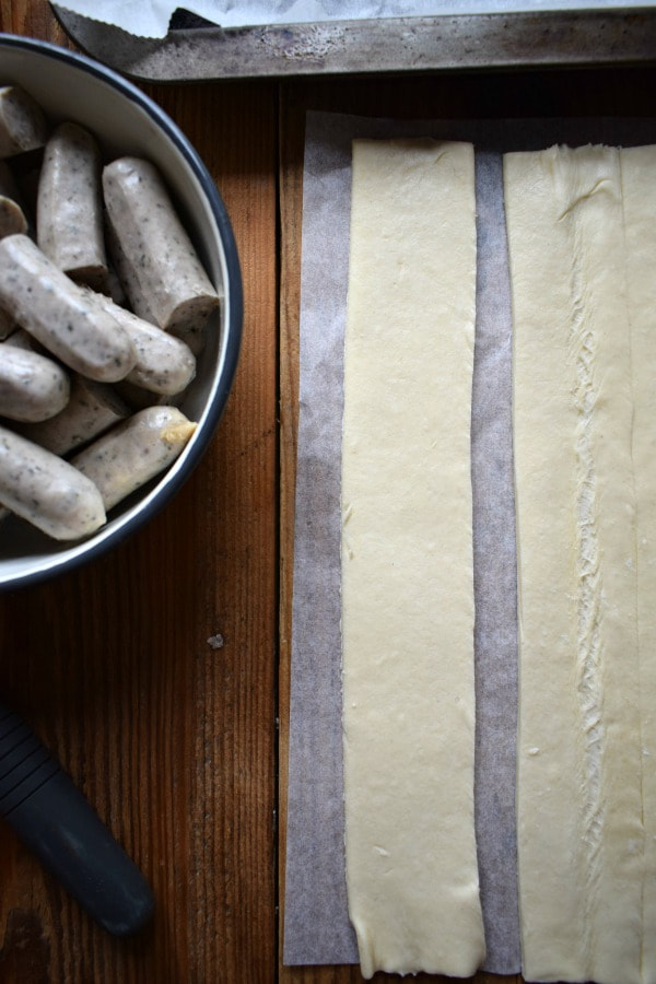 - Here’s how we put them together. First cut all your sausages in half. Then cut your pastry into thin strips. You want to cut it slightly smaller than the sausages so the sausage will peek out of each end when they are rolled up.