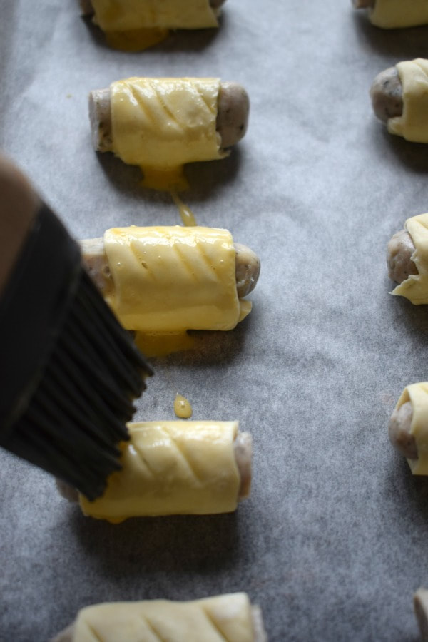 - Using a pastry brush, lightly brush all the tops of the sausage rolls with the beaten egg. If you don’t have a pastry brush, don’t worry. You can just use your fingers to brush them.