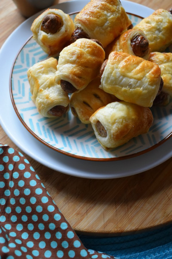 So, let’s take a little look at what we use. Just puff pastry, sausages and one beaten egg for these. I always use these sausages pictured here. I buy them at Aldi here in Spain and they are fantastic. I know a lot of my readers don’t have an Aldi, so any sort of small Chipolata sausage will do. Just make sure not to use the fat sausages for these. The key is a thin sausage for a small bite as well to ensure it cooks all the way through.