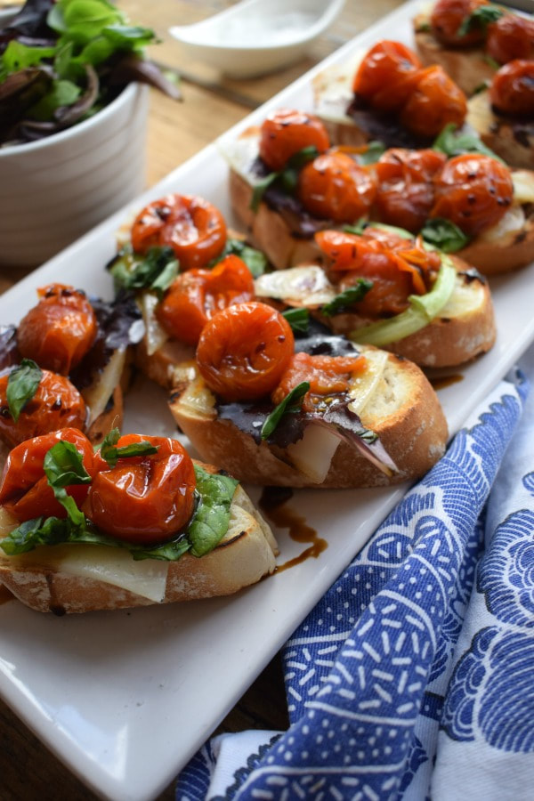 - Assemble before serving – Because the topping has a vinaigrette, don’t assemble the salad or top the bruschetta until just before serving.