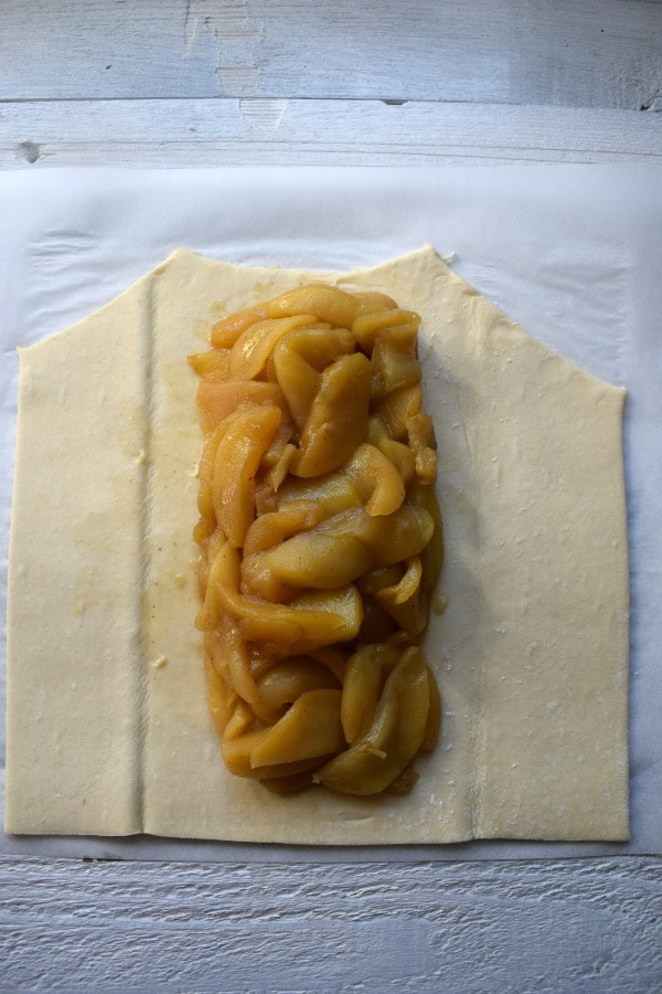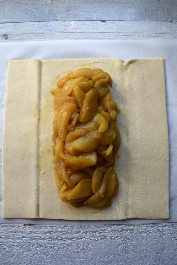 - Lay the pastry sheet on a sheet of parchment paper. Pile the apples down the center like shown here. Make sure to leave about an inch of pastry at the top and bottom.