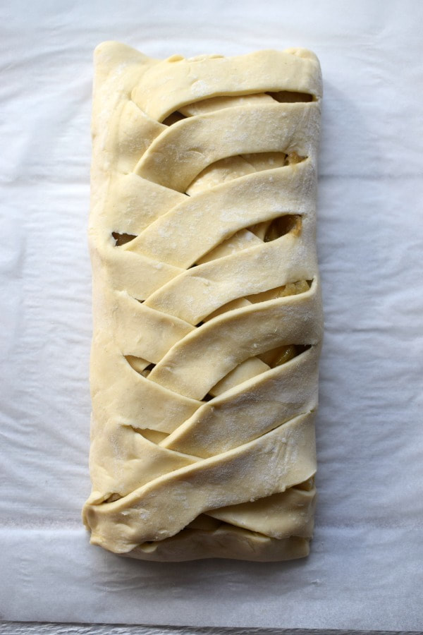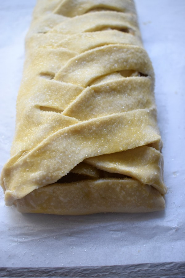- Lay out your pastry on the parchment paper on the baking tray. Spread the apple mixture in the middle third leaving about a one inch border at the top and bottom. Cut the top two corners diagonally and then continue to cut strips on each side. You will get anywhere between 6 to 8 strips. Cut away excess pastry at the bottom. Once you have all your strips cut you can start folding them over. Starting at the top left, fold the strip down on a diagonal and then the right side. Continue doing this until you have folded over all the strips. Seal the top and bottom by pulling together the pastry at the ends to meet. Gently press together. Brush with the egg wash and then sprinkle with remaining 1 tablespoon of sugar.