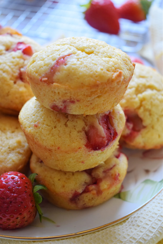 You canโt let strawberry season pass you up without making a batch of these Strawberry Shortcake Muffins. A moist and dense muffin filled with juicy sweet strawberries and topped with sprinkling of sugar to give a crisp top!