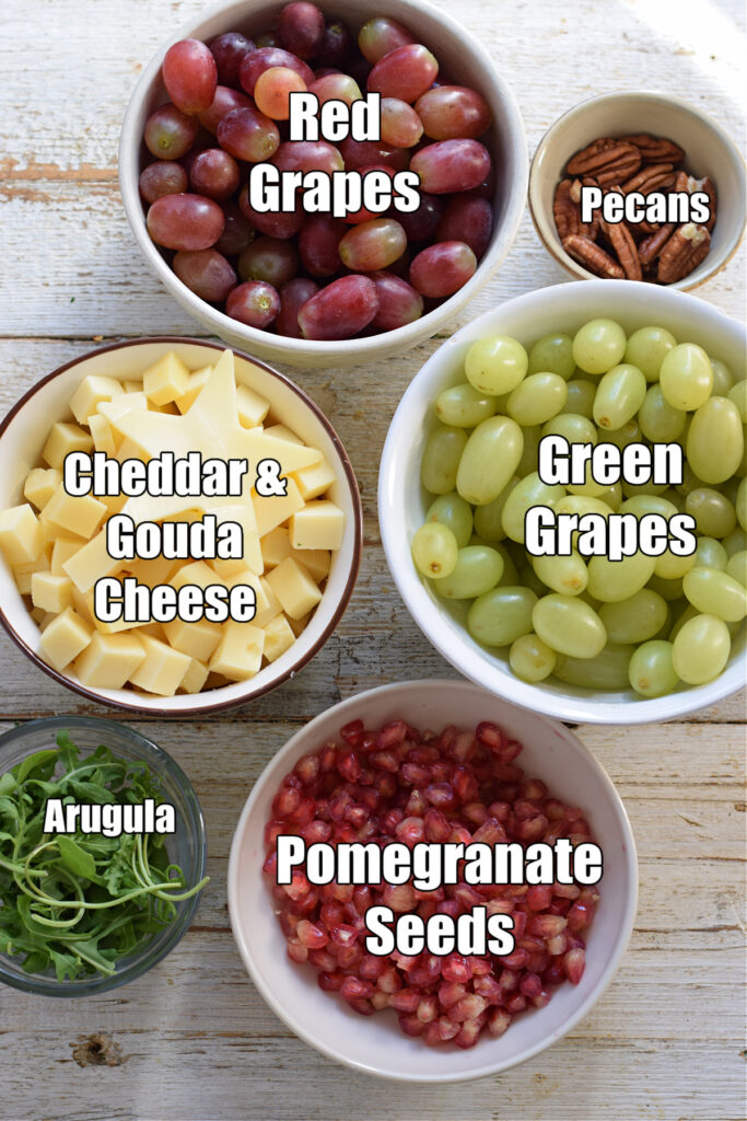 - Prepare ingredients – First cut the cheese into bite sized pieces and set aside. Wash the grapes and give them a good shake to remove excess water.