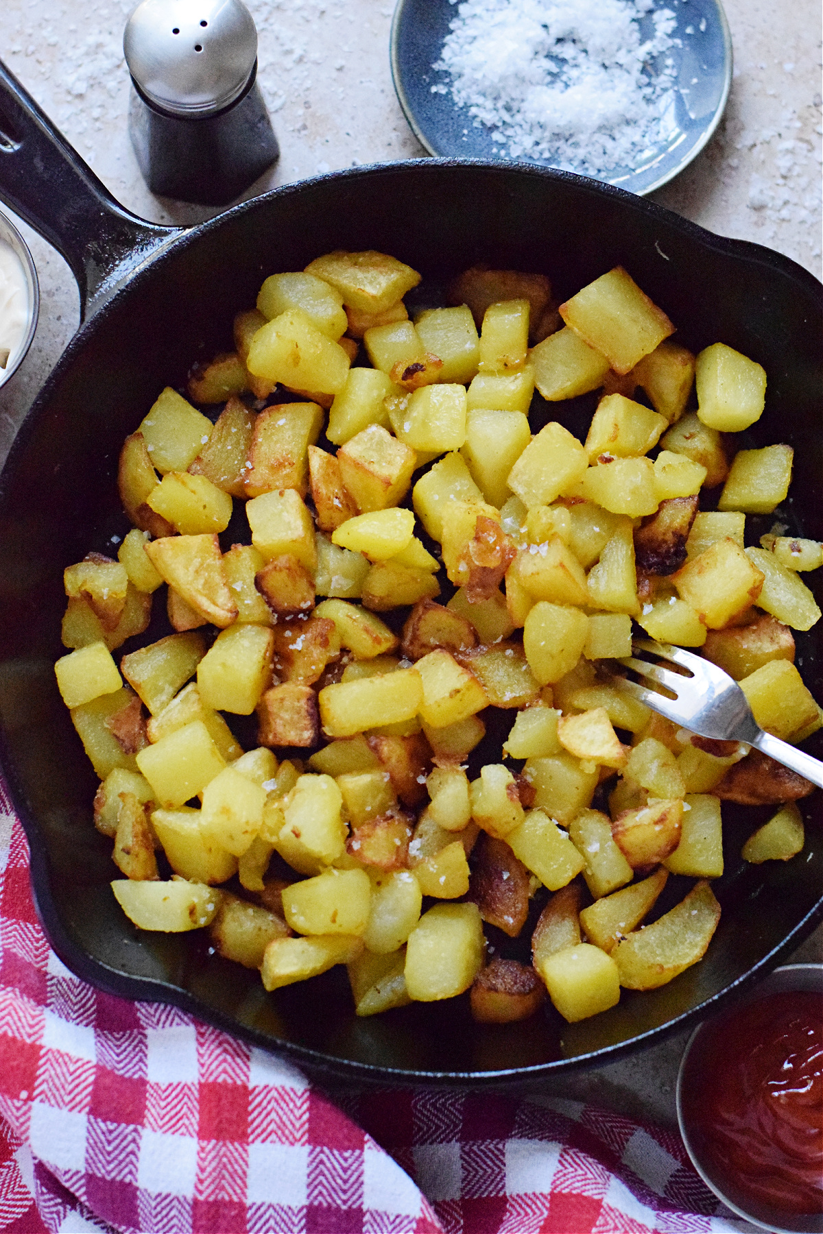 - Season and serve – Using a slotted spoon, remove the potatoes from the oil and place them on a large plate with paper towels. Season with salt and serve immediately.