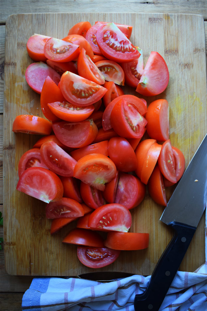 - Chop tomatoes – I quartered the tomatoes as these were fairly small tomatoes. If you have large tomatoes, you can cut them into small pieces.