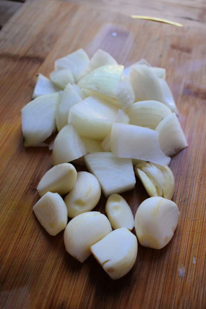- Chop onions and garlic– peel and roughly chop the onions and garlic. You can crush the garlic if you prefer.