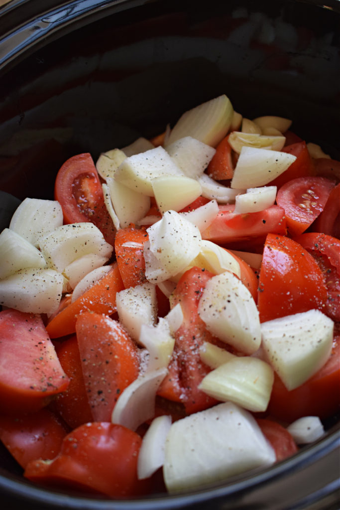 - Add Vegetables to slow cooker – add the chopped tomatoes, onions and garlic to the slow cooker. Season with salt and pepper and give a good stir.