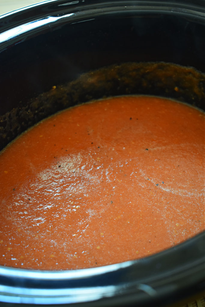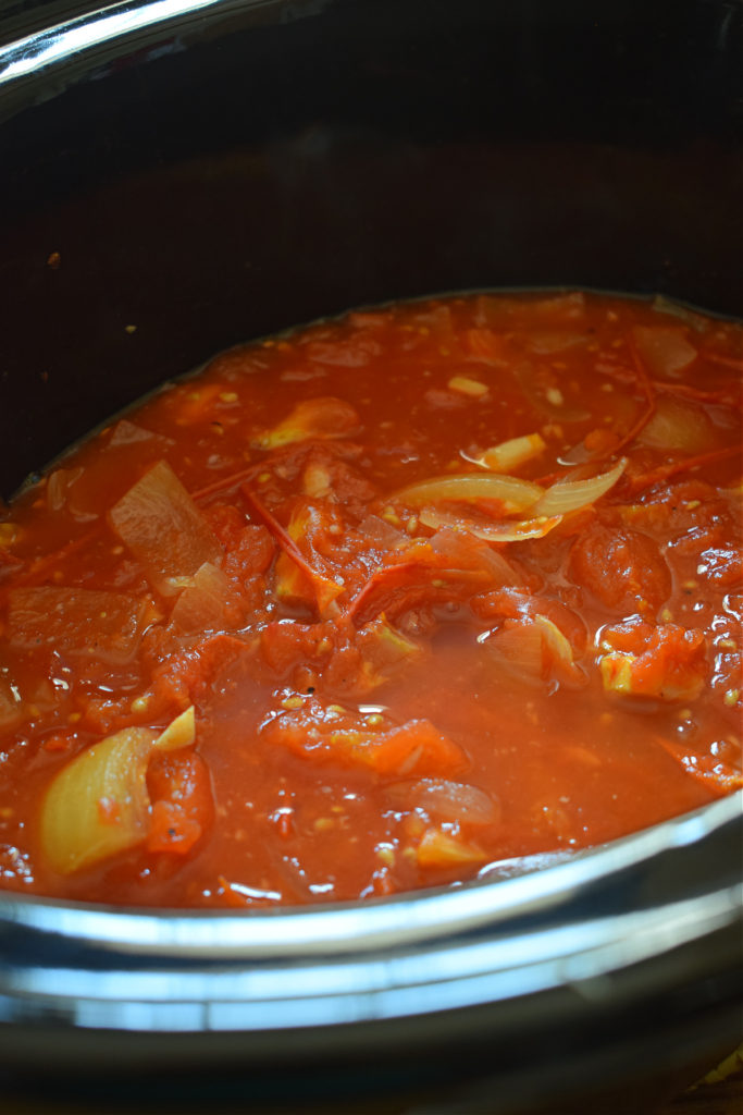 - Add the tomatoes, onion and garlic to the slow cooker. Season with salt and pepper. Give a stir. Cover and cook on low for about 6 – 8 hours. Tomatoes will be completely soft and fall apart when touched.