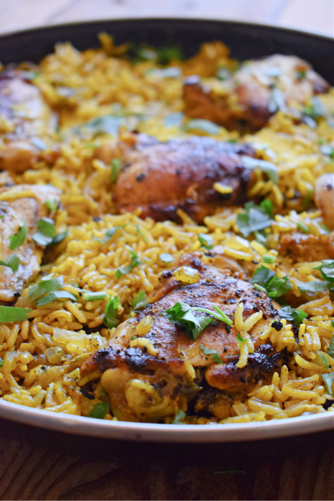 2nd time making this,,..I added some chopped peppers and green peas with the onions and garlic. A dash of zaatar and sumac with the rice and omitted the additional turmeric (seems a lot) and a squeeze of runny honey before I added the chicken back and put on a lid on my sautรฉ pan and cooked for 20mins on the stove top.( my oven is out of action)