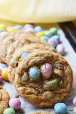 These Mini Egg Cookies are the perfect fun filled Easter cookie. A crispy yet soft and chewy cookie filled with a combination of chocolate chips and candied mini eggs. These cookies are prepared in just about 15 minutes and they bake quickly. Perfect for baking with kids through the Spring.