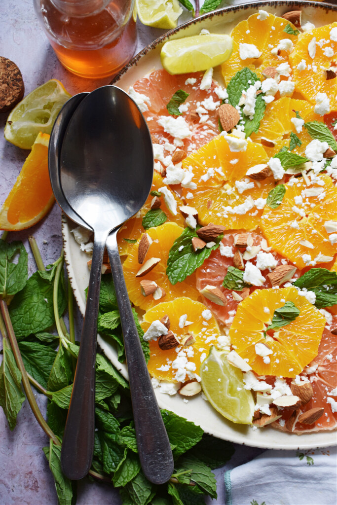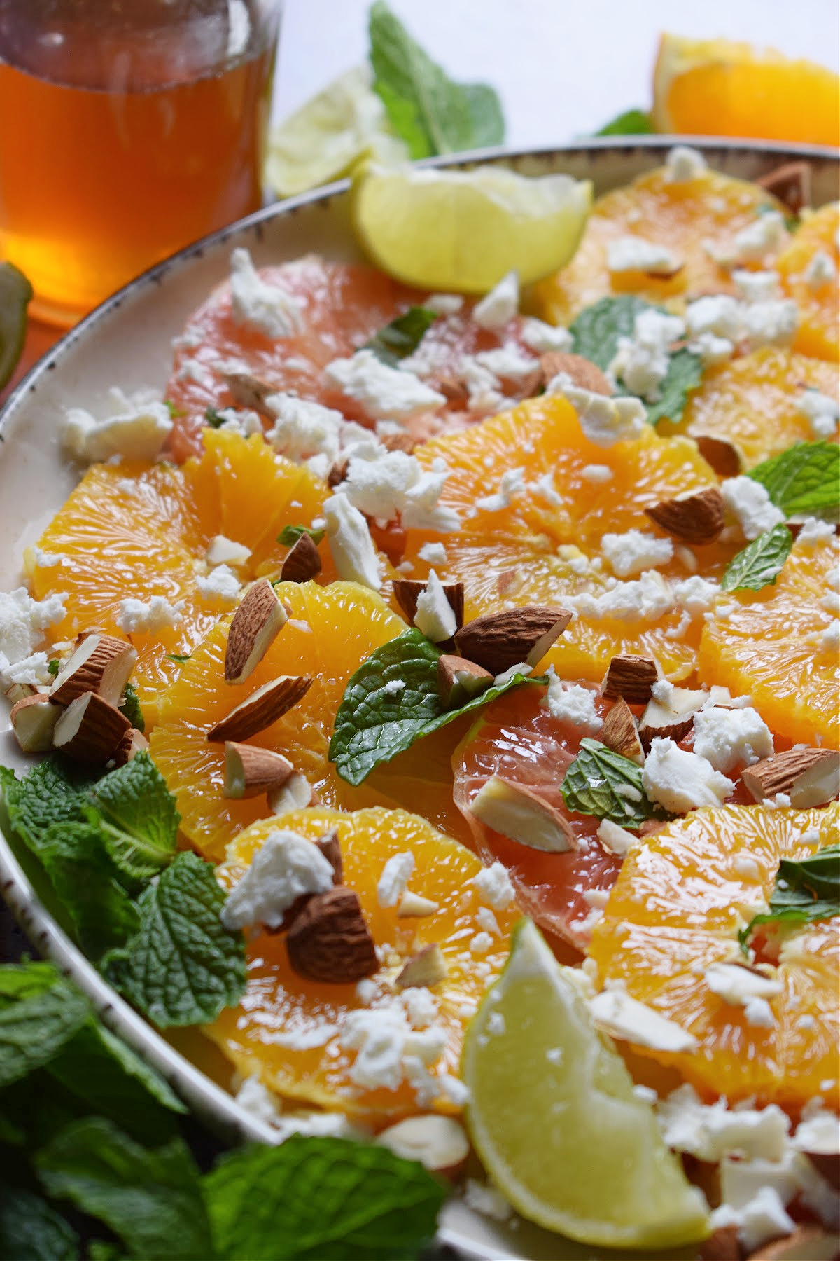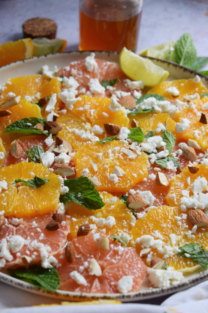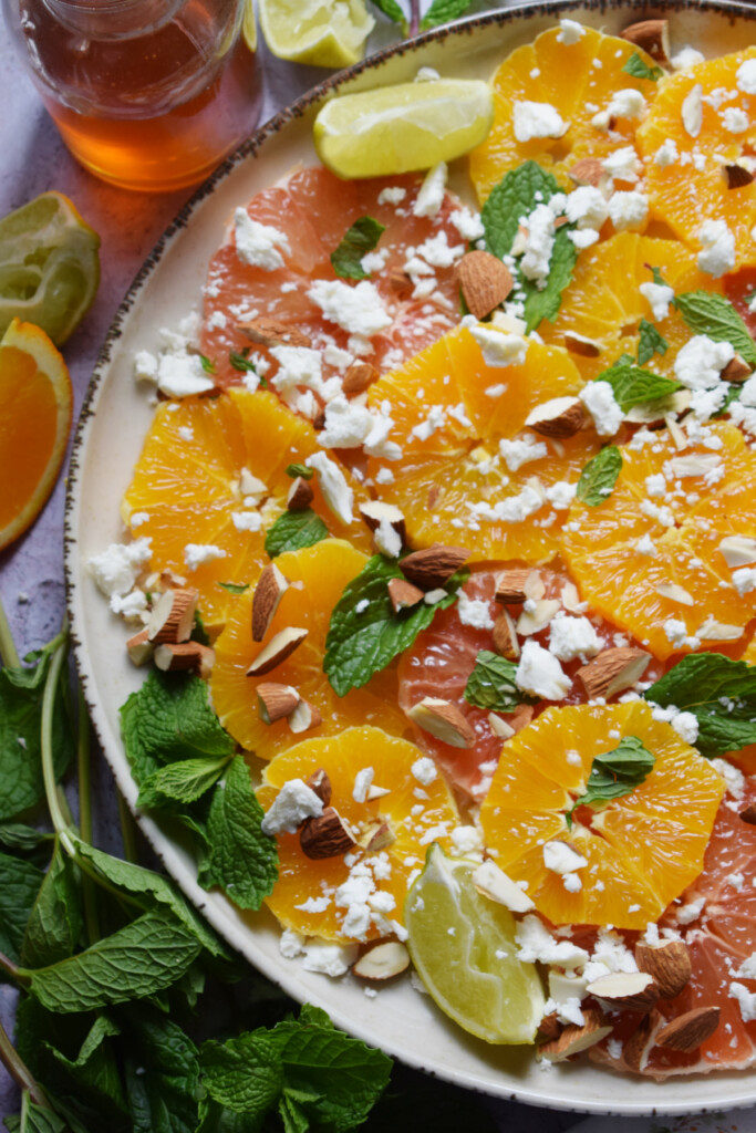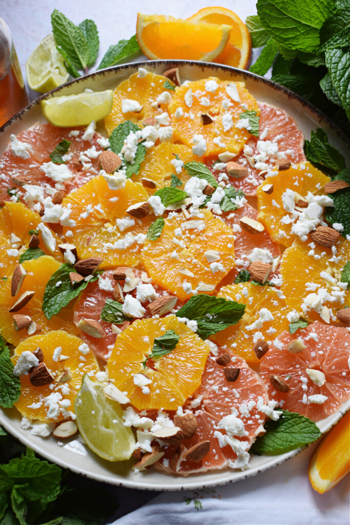 Make this fresh and light Citrus Salad with a Honey Lime Dressing to go with an Easter brunch this year. Made with oranges, grapefruits, feta cheese, raw almonds and a tangy and sweet dressing. A great addition to a buffet table!
