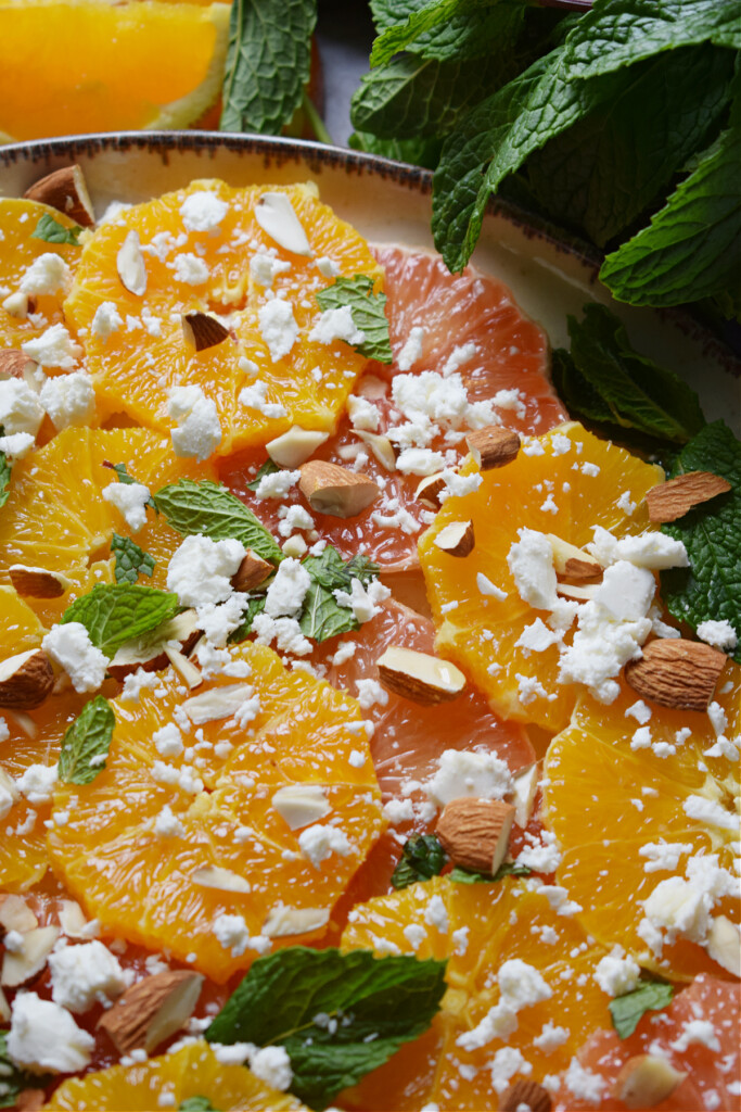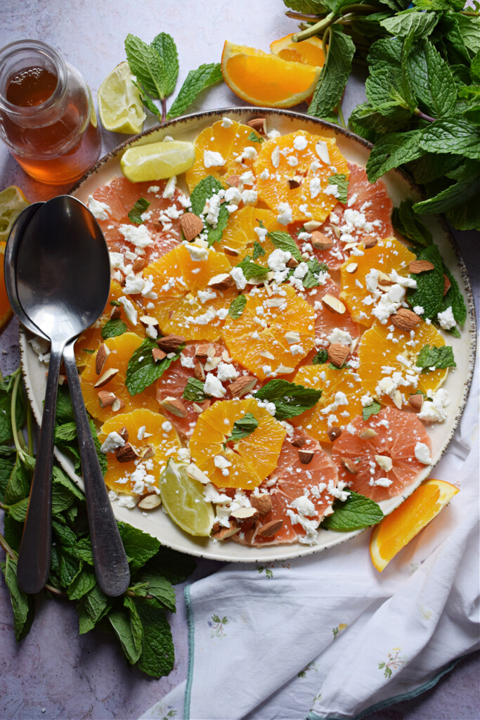- Arrange salad โ On a large serving plate, arrange the grapefruit and orange slices how you like. Sprinkle over crumbled feta cheese and chopped almonds.