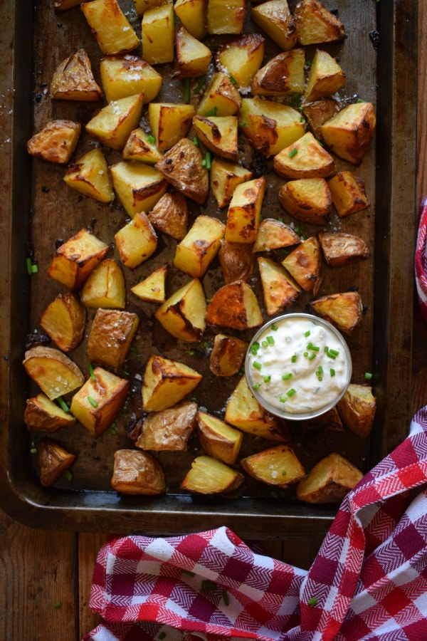 Make it! The perfect combination of crisp and creamy. Theseย Crispy Garlic Potatoes with a Creamy Chive Dipย can be served as a little snack food, a side dish or great to bring to a cook out! It's all about the dip.