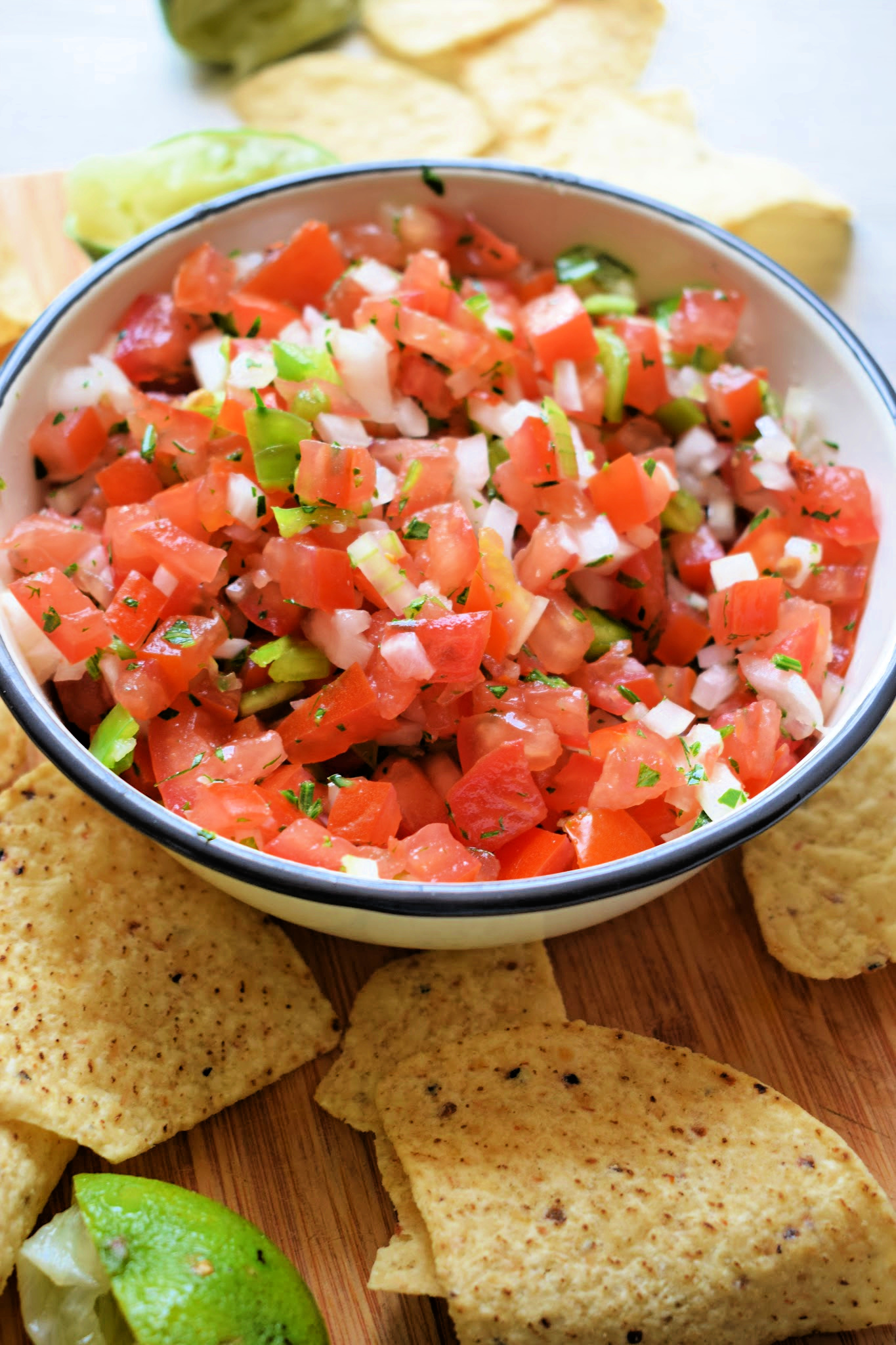 Homemade Pico de Gallo makes a great dip for tortilla chips, topping for tacos or even a salad. This Mexican dip is loaded with fresh tomatoes, onions, peppers, lime juice and cilantro.