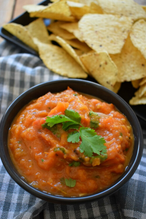 Have you ever tired Roasted Tomato Salsa for a change to the fresh stuff? The flavour is milder and smoother and it goes great with quesadillas, tacos, fajitas, nachos and more.