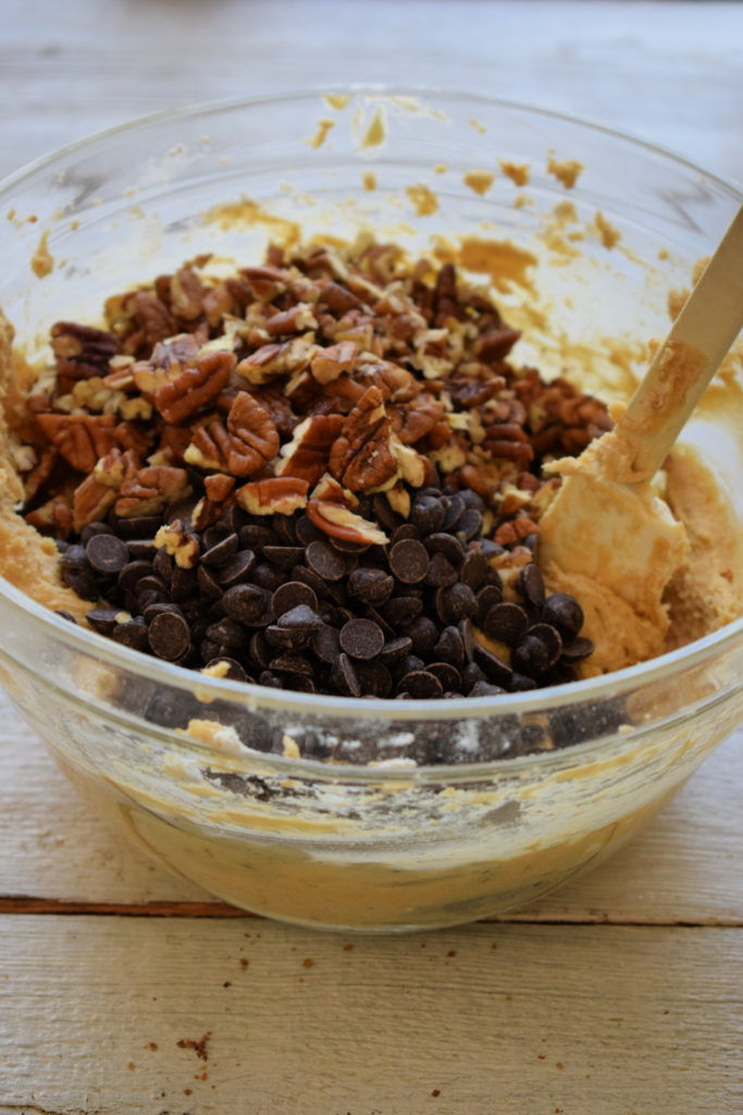 - Add flour and remaining ingredients – Stir in flour mixture until combined. Fold in chocolate chips and pecans.